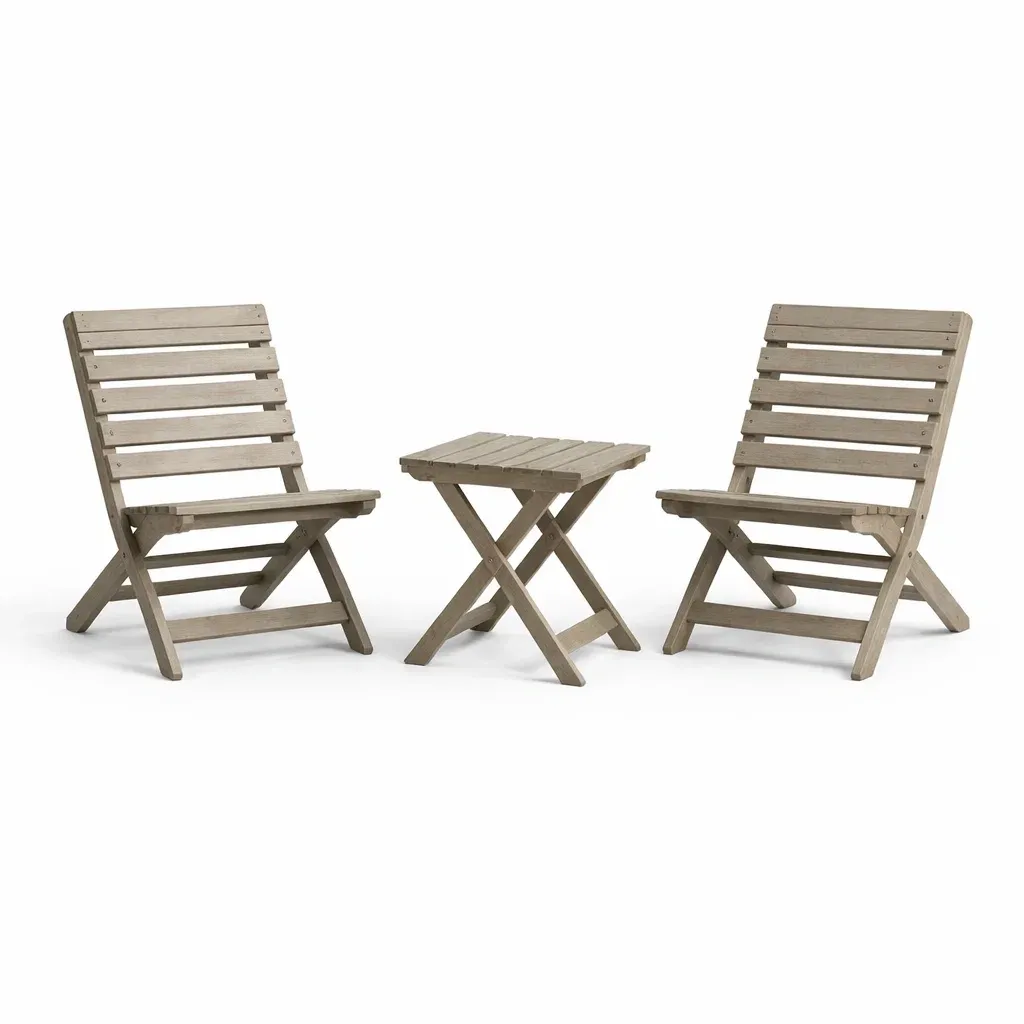 Set da relax piccolo da giardino in legno grigio con due sedie pieghevoli e tavolo