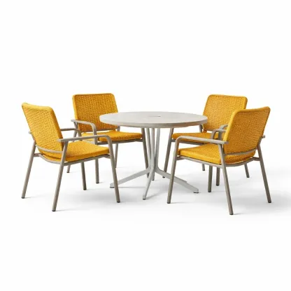 Set tavolo e sedie da pranzo per esterno in metallo e tessuto intrecciato giallo con tavolo rotondo diametro cento centimetri e sedie 55x55x85 cm