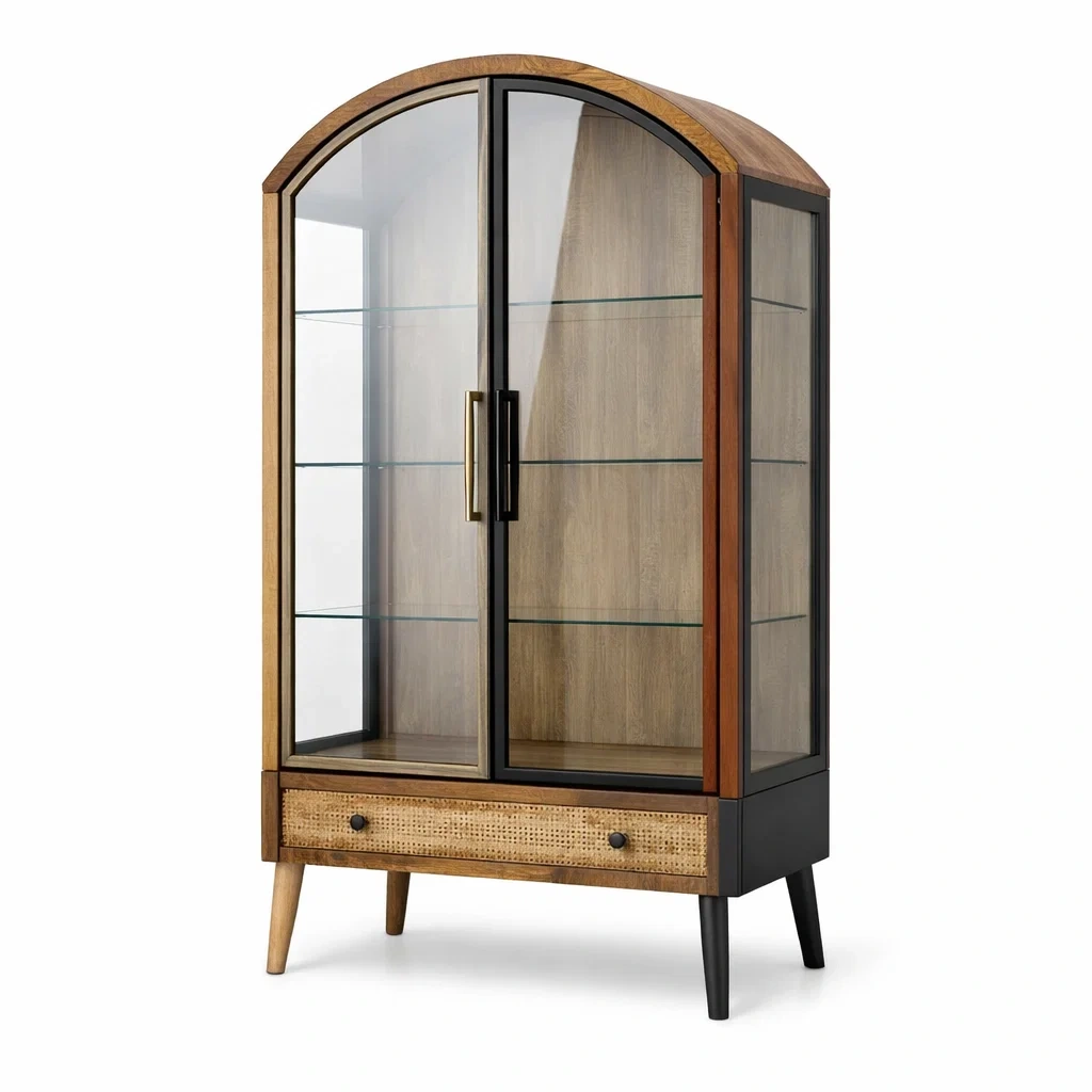 Vetrina in legno e vetro temperato con cassetto e ripiani